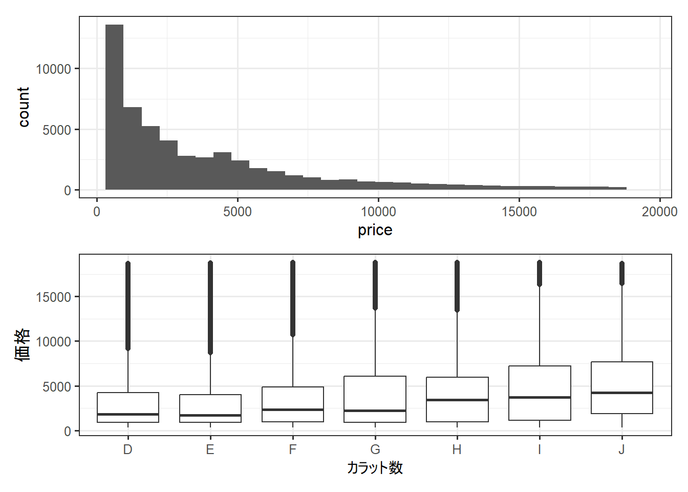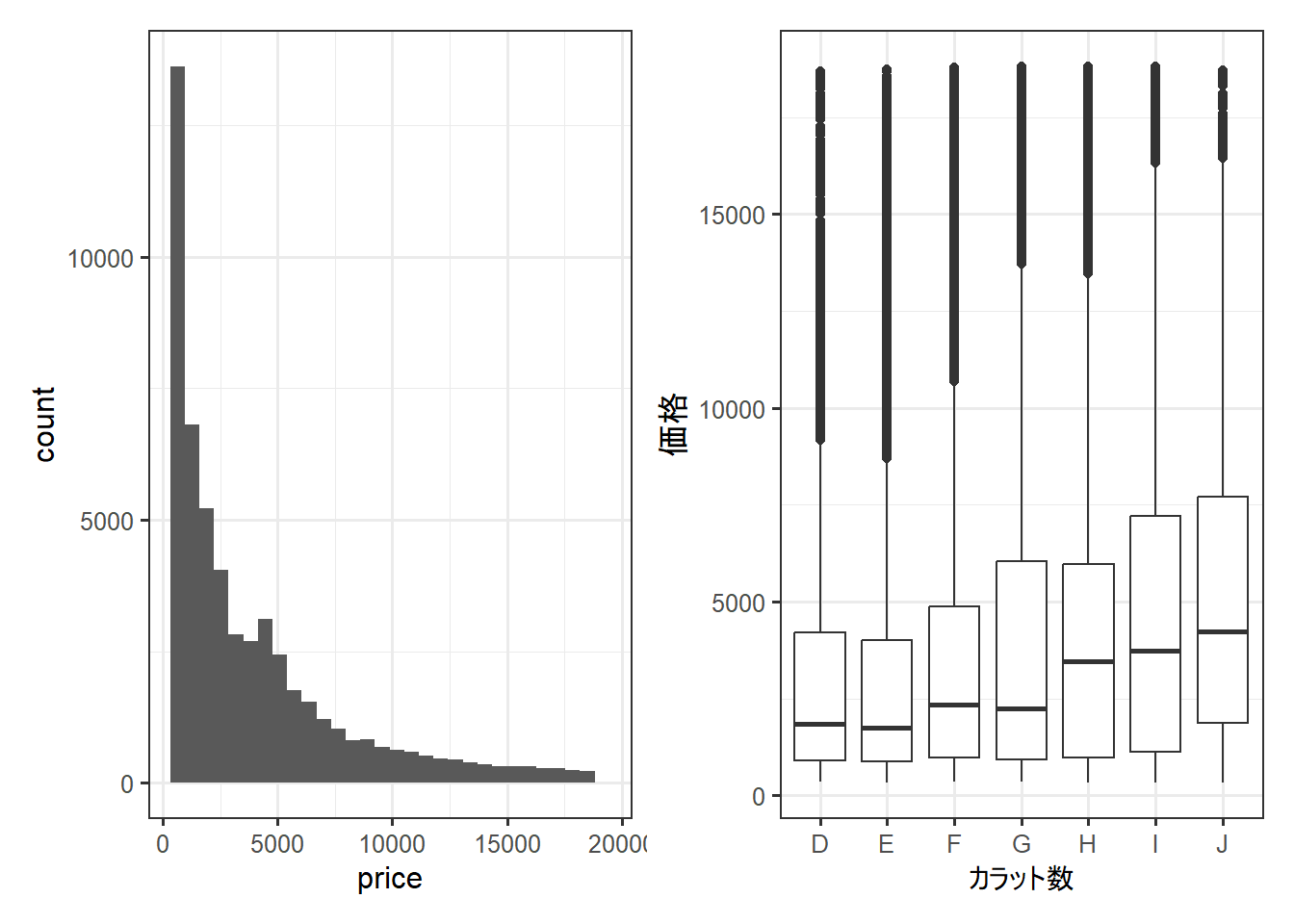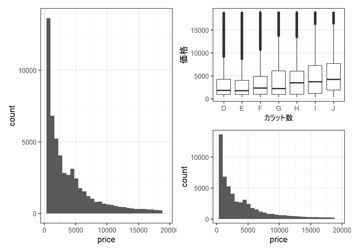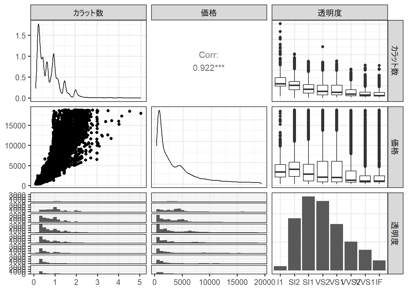 columnLabels = c("カラット数", "価格", "透明度") # 出力するグラフの列名を指定できる